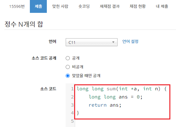 백준 온라인 저지(BOJ) 15596번 정수 N개의 합