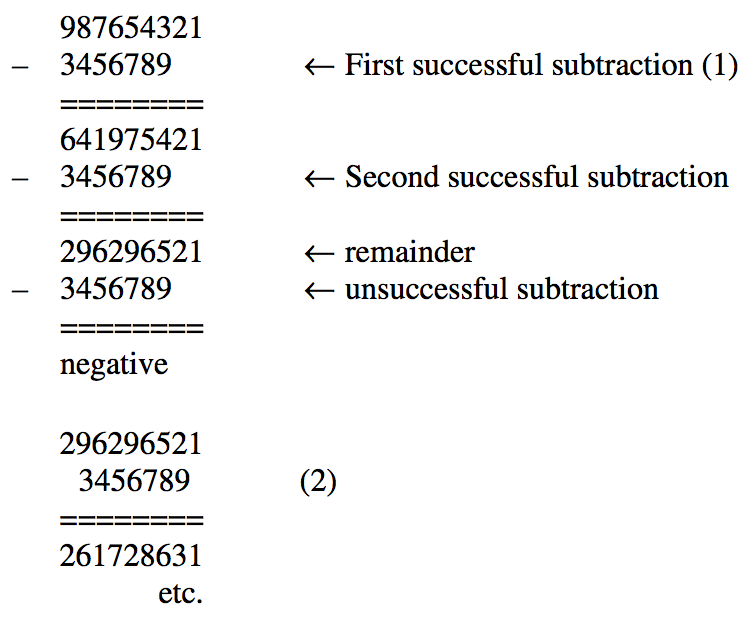 그래서 처음에는 피제수가 0보다 작아질 때 까지 [피제수 빼기 제수] 를 반복한 뒤