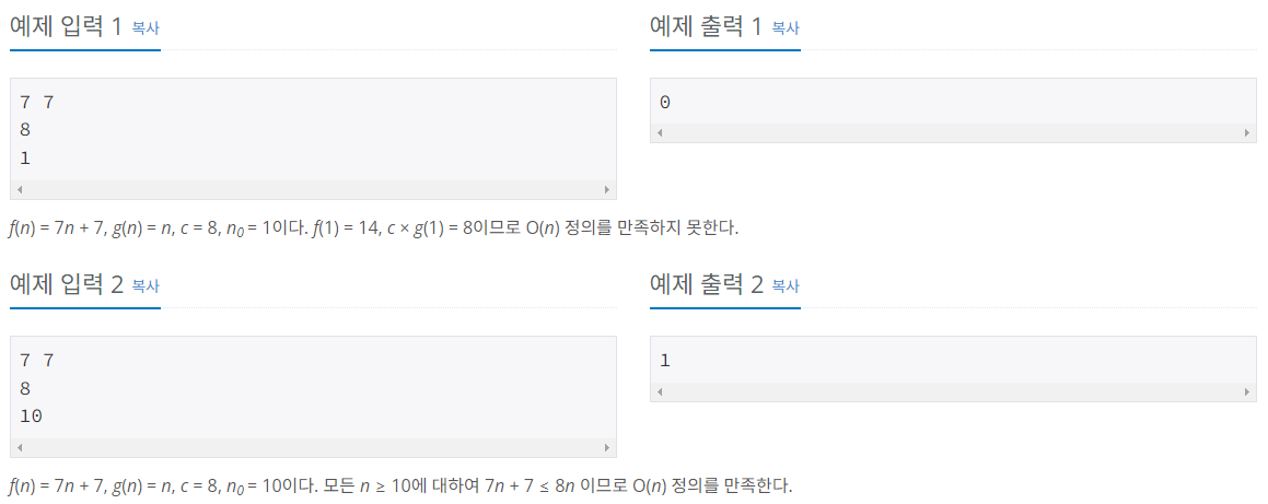 백준 온라인 저지(BOJ) 24313번 알고리즘 수업 - 점근적 표기 1