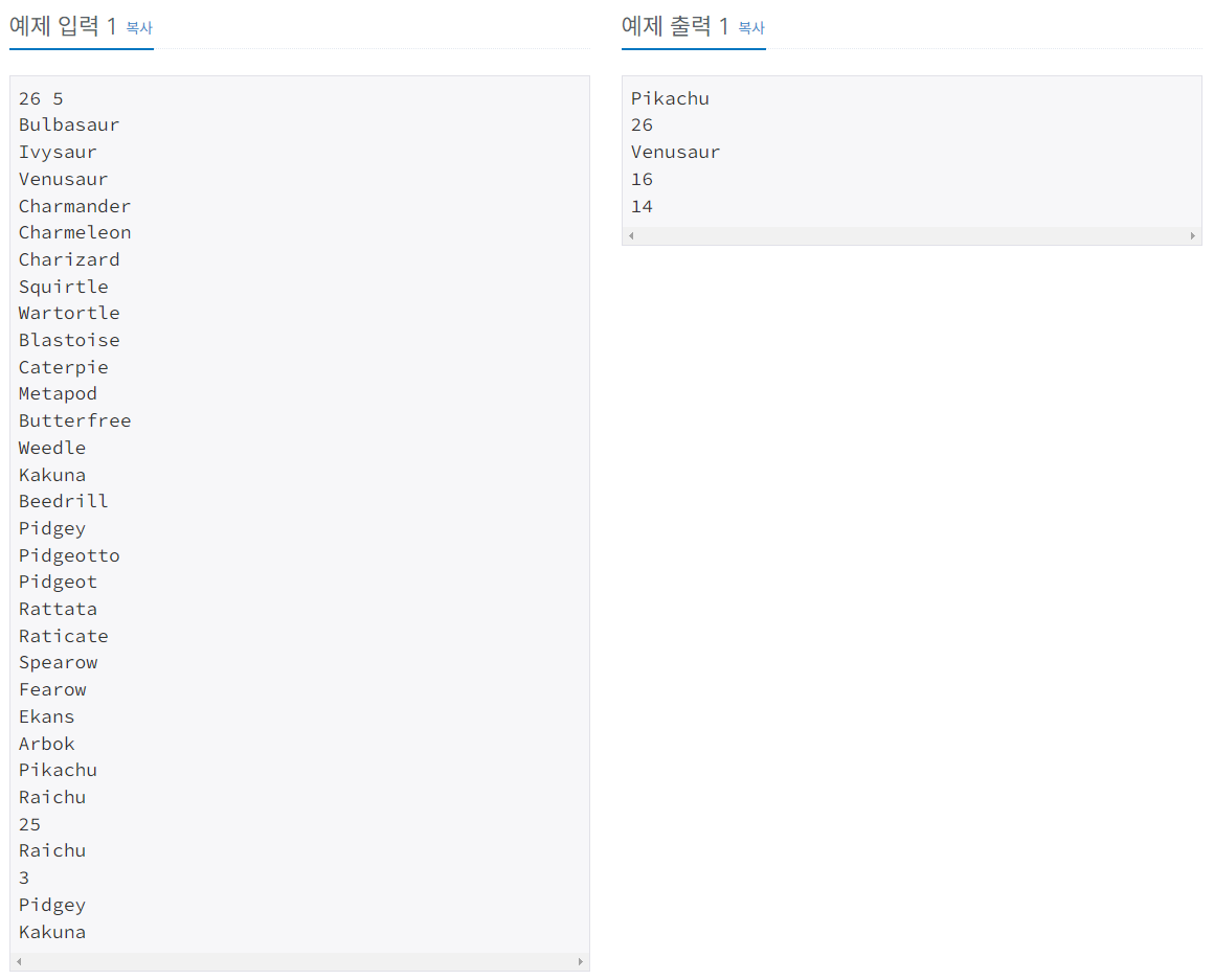 첫째 줄에는 도감에 수록되어 있는 포켓몬의 개수 N이랑 내가 맞춰야 하는 문제의 개수 M이 주어져. N과 M은 1보다 크거나 같고, 100,000보다 작거나 같은 자연수인데, 자연수가 뭔지는 알지? 모르면