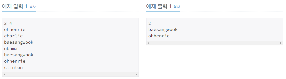 첫째 줄에 듣도 못한 사람의 수 N, 보도 못한 사람의 수 M이 주어진다. 이어서 둘째 줄부터 N개의 줄에 걸쳐 듣도 못한 사람의 이름과, N+2째 줄부터 보도 못한 사람의 이름이 순서대로 주어진다.