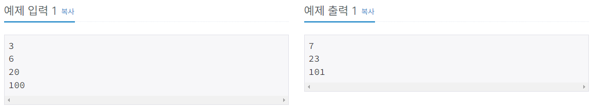각 정수보다 크거나 같은 소수 중 가장 작은 소수 출력