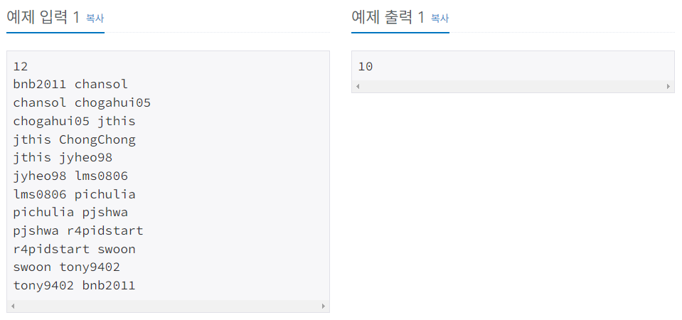 첫번째 줄에는 사람들이 만난 기록의 수 $N\ (1 \le N \le 1\ 000)$이 주어진다. 두번째 줄부터 $N$개의 줄에 걸쳐 사람들이 만난 기록이 주어진다. $i + 1$번째 줄에는 $i$번째로 만난 사람들의 이름 $A_i$