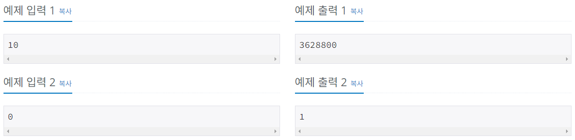 재귀 함수를 활용해서 factorial 함수를 구현하면 되는 단순한 문제입니다.