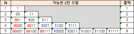 특별한 규칙이 보이지 않아서 1부터 5까지 가능한 모든 2진 수열을 직접 적어보며 규칙을 찾아보았습니다.