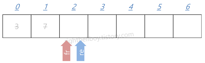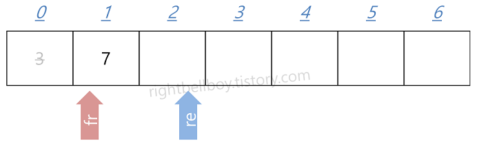 여기에 7이라는 값을 다시 넣는다고 하면, 마찬가지로 re(index 1)에 해당 값을 넣고 re를 1 증가시킵니다.