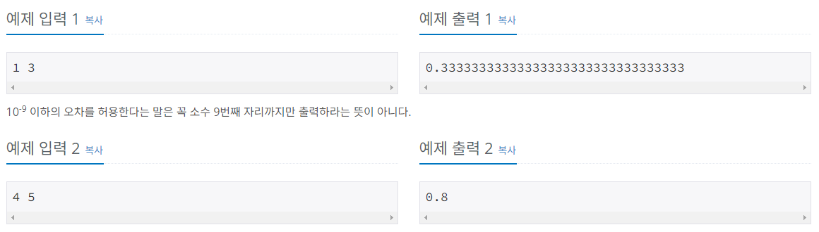 백준 온라인 저지(BOJ) 1008번 A/B