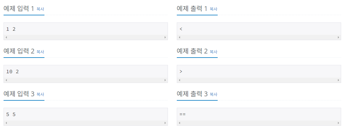 두 정수 A와 B가 주어졌을 때, A와 B를 비교하는 프로그램을 작성하시오.