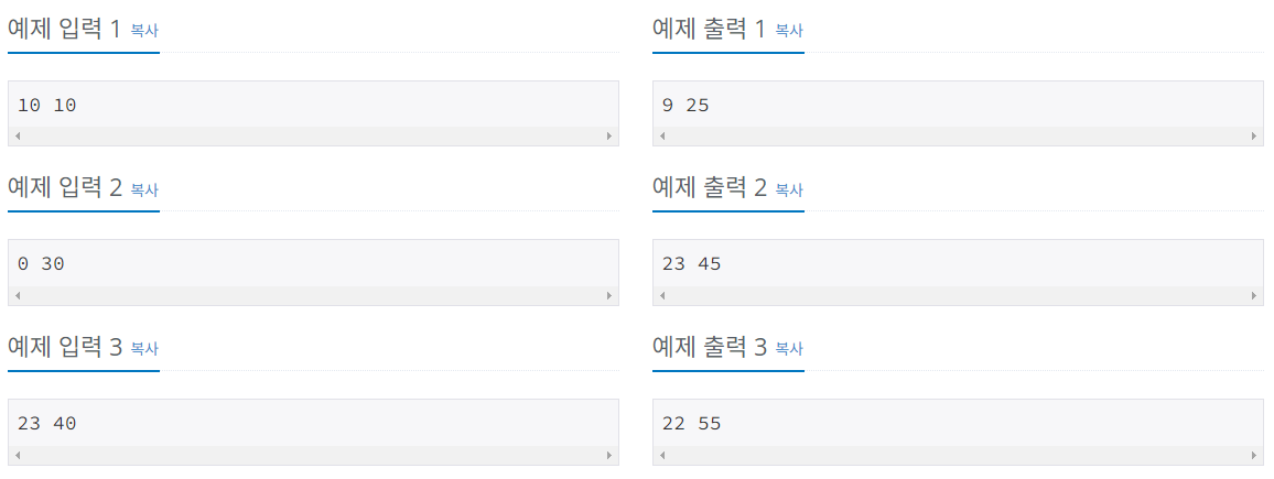 입력받은 두 정수 H, M 은 최초 알람 시간 H시 M분을 의미